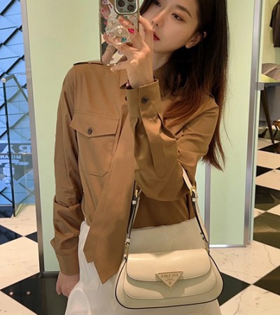 [홍콩명품,PRADA] 프라다 23SS 삼각로고 넥타이 장식 남방 셔츠 (브라운), BM8883, TBG, 온라인명품쇼핑몰,남자명품의류,인터넷쇼핑몰,해외직구 > 여성몰