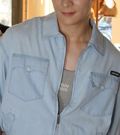 [홍콩명품,MIU MIU] 미우미우 24SS 로고 데님 카라 봄버 자켓 (스카이블루), BM17838, JL, 홍콩명품의류,구매대행,온라인명품 > 남자의류