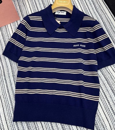 • [홍콩명품,MIU MIU] 미우미우 25SS 로고 여성 스트라이프 카라 폴로 반팔 티셔츠 (블루), BM19724, TBG, 홍콩명품의류,구매대행,온라인명품