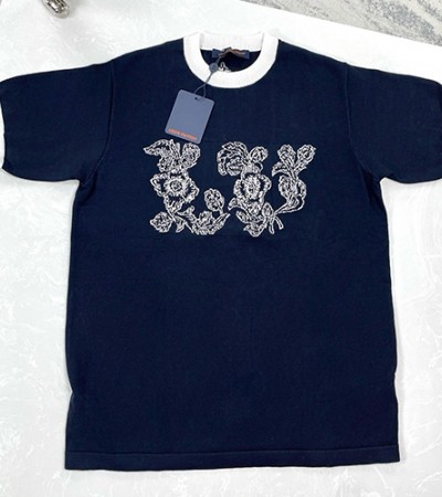 • [홍콩명품.LOUIS VUITTON] 루이비통 25SS 로고 패턴 니트 반팔 티셔츠 (네이비), BM21006, JU, 홍콩명품의류,구매대행,온라인명품