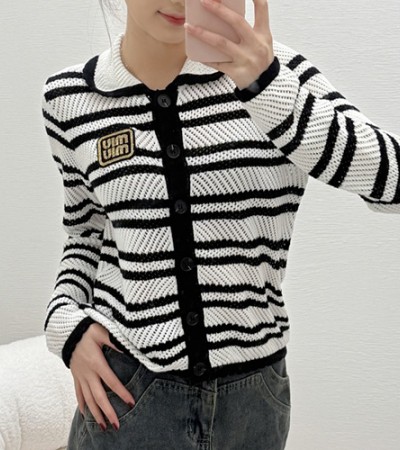 [홍콩명품,MIU MIU] 미우미우 25SS 로고 여성 스트라이프 카라 니트 가디건 (화이트), BM22170, JL, 레플리카의류,미러급사이트 > 여성몰