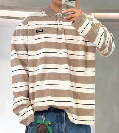 [홍콩명품,MIU MIU] 미우미우 25SS 로고 스트라이프 카라 폴로 긴팔 티셔츠 (화이트-브라운), BM22338, KK, 레플리카의류,미러급사이트 > 남자의류