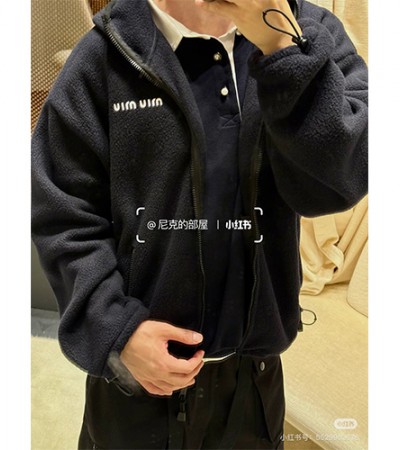 • [홍콩명품,MIU MIU] 미우미우 25SS 로고 자수 플리스 후드 자켓 (네이비), BM22412, KB, 레플리카의류,미러급사이트