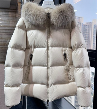 • [홍콩명품.MONCLER] 몽클레어 25SS 로고 여성 폭스퍼 후드 구스다운 패딩 자켓 (화이트), BM23210, KSM, 레플리카의류,미러급사이트