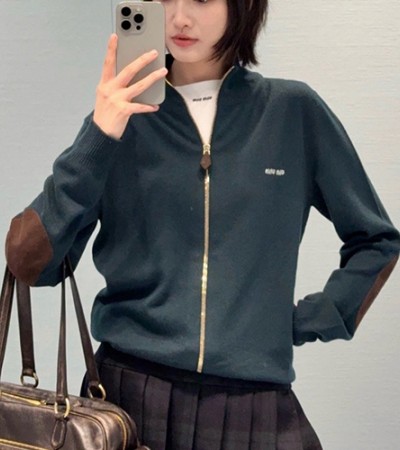 • [홍콩명품,MIU MIU] 미우미우 25SS 로고 여성 하이넥 캐시미어 니트 집업 자켓 (그린), BM23959, JL, 레플리카의류,미러급사이트
