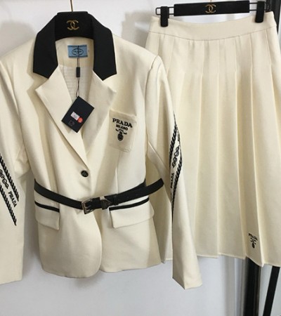 [홍콩명품,PRADA] 프라다 24SS 로고 자수 자켓 + 미디스커트 상하의 세트 (아이보리), BM11532, BR, 홍콩명품의류,구매대행,온라인명품 > 여성몰