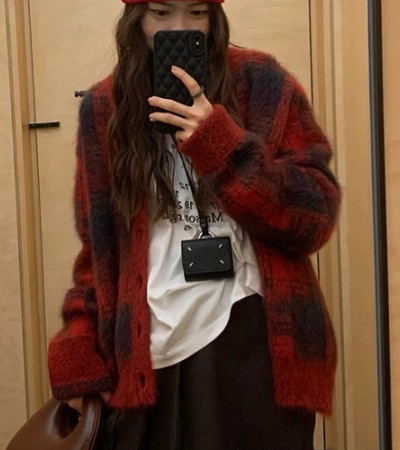 • [홍콩명품.Maison Margiela] 메종마르지엘라 24SS 로고 여성 V넥 체크 니트 가디건 (레드), BM11923, TBG, 홍콩명품의류,구매대행,온라인명품
