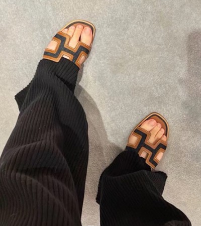 • [홍콩명품.Hermes] 에르메스 24SS 로고 여성 레더 데님 산토리니 샌들 슬리퍼 (브라운), SE2703, H3, 명품스니커즈,운동화,구두,로퍼,하이탑,신발