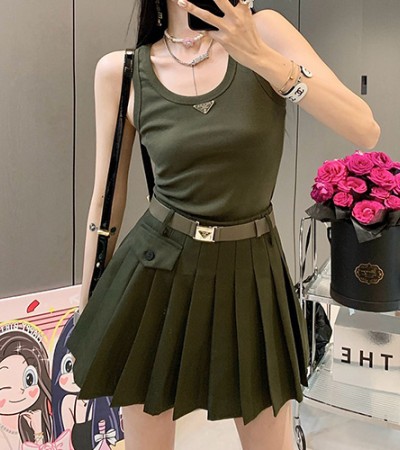 • [홍콩명품,PRADA] 프라다 24SS 삼각로고 여성 탑 셔츠 + 미니 스커트 상하의 세트 (카키), BM13683, S1F, 홍콩명품의류,구 매대행,온라인명품