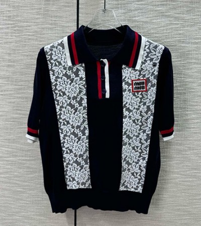 [홍콩명품,MIU MIU] 미우미우 24SS 로고 여성 레이스장식 쇼트 폴로 니트 반팔 티셔츠 (2컬러), BM14699, TBG, 홍콩명품의류,구매대행,온라인명품 > 여성몰