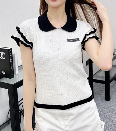 • [홍콩명품,MIU MIU] 미우미우 24SS 로고 여성 니트 반팔 티셔츠 (2컬러), BM15586, TBG, 홍콩명품의류,구매대행,온라인명품