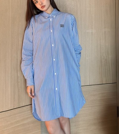 [홍콩명품,MIU MIU] 미우미우 24SS 로고 자수 여성 스트라이프 오버핏 원피스 남방 셔츠 (스카이블루), BM15710, TBG, 홍콩명품의류,구매대행,온라인명품 > 여성몰