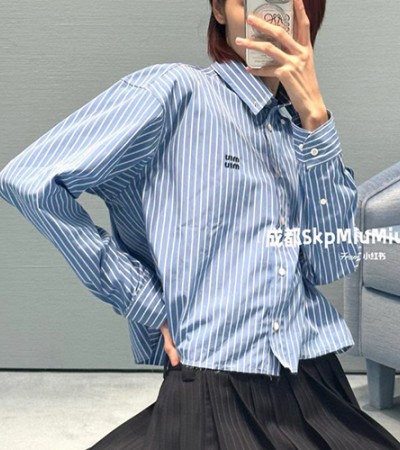 • [홍콩명품,MIU MIU] 미우미우 24SS 로고 자수 여성 스트라이프 쇼트 남방 셔츠  (스카이블루), BM15711, TBG, 홍콩명품의류,구매대행,온라인명품