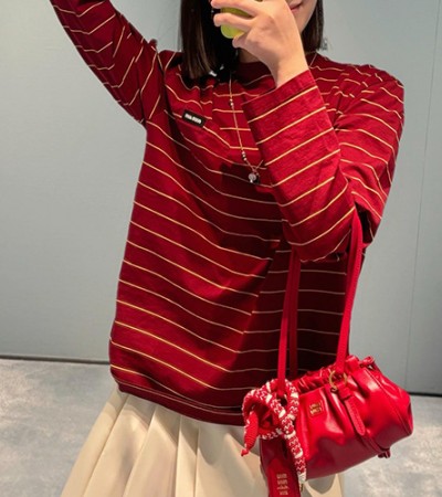• [홍콩명품,MIU MIU] 미우미우 25SS 로고 스트라이프 긴팔 티셔츠 (레드), BM19737, TBG, 홍콩명품의류,구매대행,온라인명품