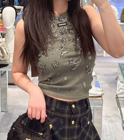 • [홍콩명품,MIU MIU] 미우미우 25SS 로고 여성 주얼리 장식 런닝 탑 티셔츠 (그레이), BM20782, TBG, 홍콩명품의류,구매대행,온라인명품