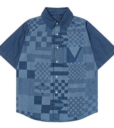 • [홍콩명품.LOUIS VUITTON] 루이비통 25SS 로고 다미에 데님 반팔 남방 셔츠 + 쇼츠 반바지 상하의 세트, BM22008, 레플리카의류,미러급사이트