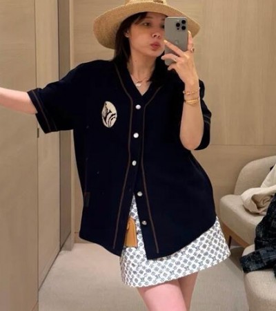 • [홍콩명품.LOUIS VUITTON] 루이비통 25SS 로고 여성 V넥 오픈 반팔 티셔츠 (네이비), BM22703, TBG, 레플리카의류,미러급사이트