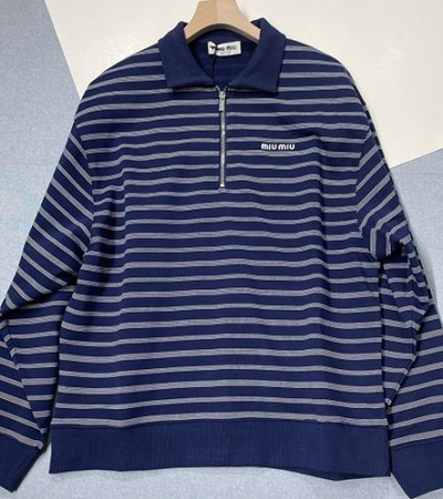 • [홍콩명품,MIU MIU] 미우미우 25SS 로고 자수 스트라이프 하프지퍼 카라 니트 스웨터 (네이비), BM22731, JL, 레플리카의류,미러급사이트