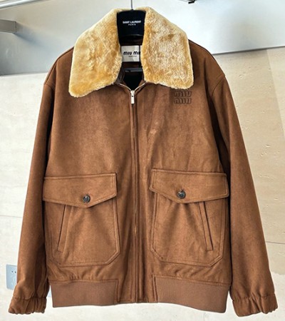 [홍콩명품,MIU MIU] 미우미우 25SS 로고 여성 퍼카라 레더 가죽 솜패딩 봄버 자켓 (브라운), BM22992, KB, 레플리카의류,미러급사이트 요약정보 및 구매