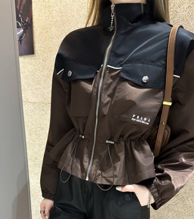 • [홍콩명품,PRADA] 프라다 25SS 삼각로고 여성 나일론 집업 자켓 (브라운-블랙), BM23074, MC, 레플리카의류,미러급사이트