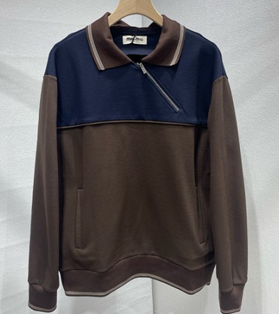 • [홍콩명품,MIU MIU] 미우미우 25SS 로고 하프지퍼 카라 맨투맨 티셔츠 (네이비-브라운), BM23577, JL, 레플리카의류,미러급사이트