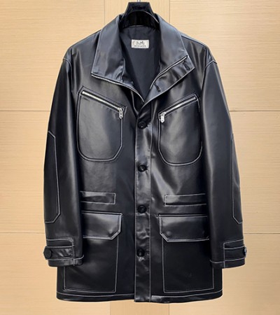 • [홍콩명품.Hermes] 에르메스 25SS 로고 레더 가죽 카라 코트 자켓 (블랙), BM23937, 레플리카의류,미러급사이트