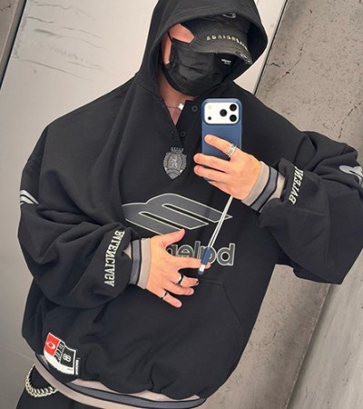 • [홍콩명품.BALENCIAGA] 발렌시아가 25SS 로고 자수 기모 후드 티셔츠 (블랙), BM24125, KB, 레플리카의류,미러급사이트